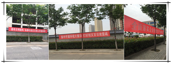 “倡導文明新風 弘揚社會主義核心價值體系”、“集中開展環(huán)境大整治 打好創(chuàng)文百日攻堅戰(zhàn)”、“全面落實企業(yè)安全生產主體責任”,這些橫幅上的宣傳標語時刻提醒著我們要高度重視創(chuàng)文工作、安全生產工作。